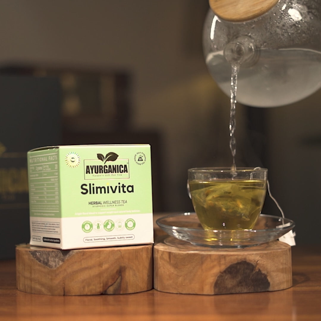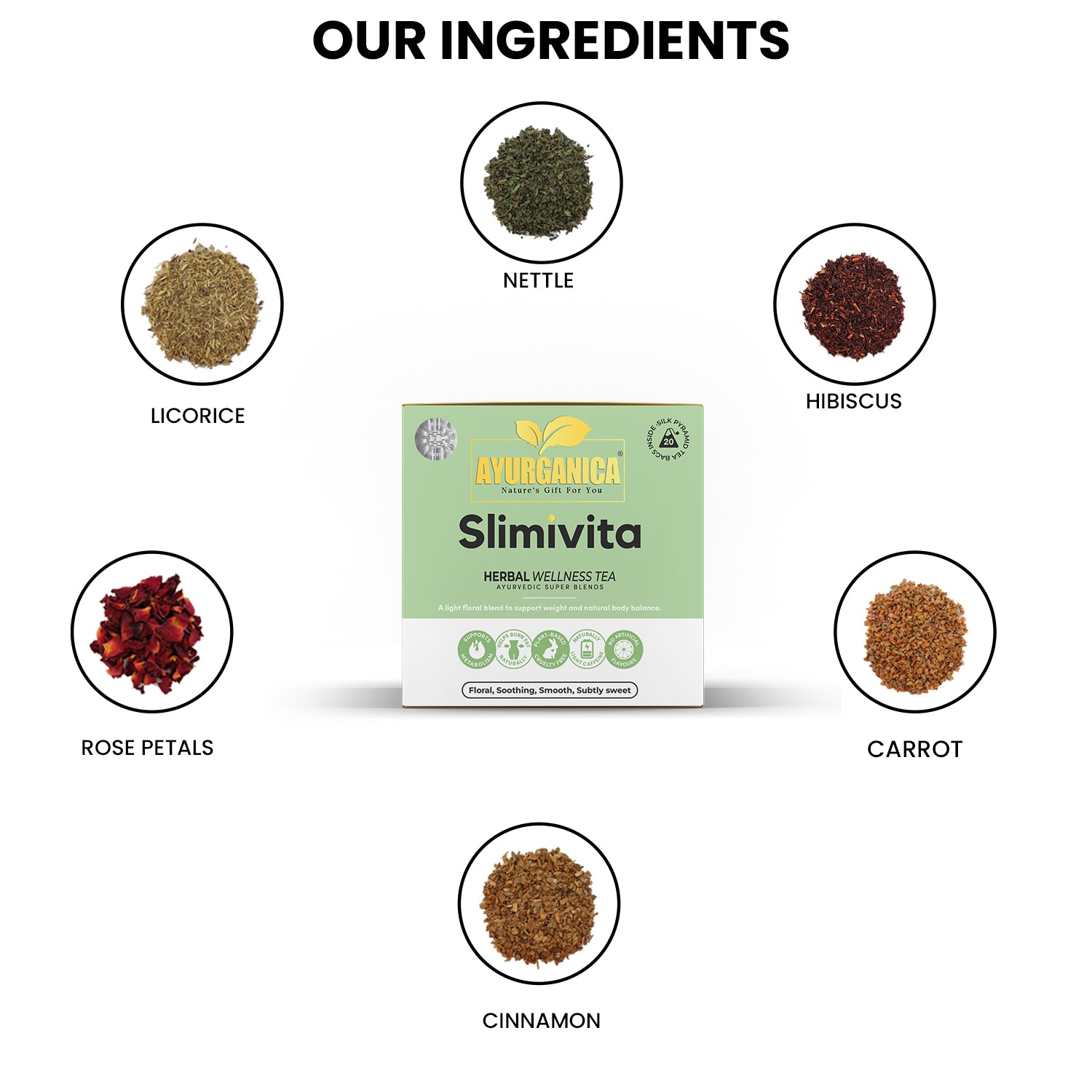 Slimivita is a light and refreshing tea blend created to support weight management naturally. Made with white tea, hibiscus, rose petals, lotus petals, nettle leaf, and cinnamon, it promotes metabolism and helps you feel light and refreshed.